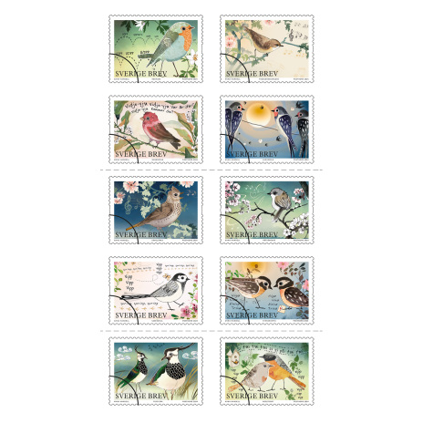 Inrikes frimärken med temat Vårfåglar. Självhäftande och kommer på ark med 10 frimärken alla med olika motiv. --Valör: Inrikes --10 frimärken med 5 olika motiv --Självhäftande --På ark
