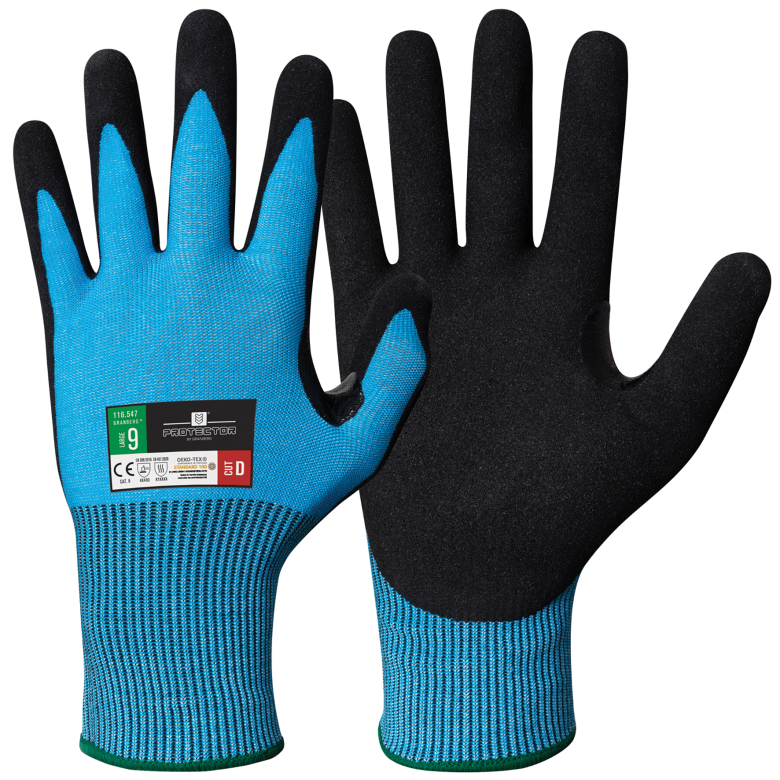 Arbete där höga krav ställs på nötningsmotstånd och där det finns risk för skärskador. Bilindustri & bilmek, Bygg & anläggning, Glashantering, Lager & logistik, Underhåll, Olja, gas & gruvdrift, Papper & massa, Stål- & metall. -- Blå/Svart -- Finns i flera storlekar -- 12 par/krt -- Montagehandskar med skärskydd samt mycket bra rivhållfasthet och nötningsmotstånd -- 15 gauge väv av Typhoon® HPPE och stålfiber ger 360° skydd mot skär (EN 388:2016) utan att kompromissa med komfort och flexibiltet -- Mycket god fingerkänsla -- Utmärkt grepp i torra, våta och oljiga miljöer ? doppning i sandaktig nitril (mikroporös nitril) som tränger undan vätskor på ytan och ger en ?sugeffekt? vilket ger ett särskilt bra grepp på våta och oljiga föremål -- Tätslutande modell som sitter bekvämt -- Typhoon® teknologin använder sig av en av de starkaste fibrerna i världen -- EN-STANDARD -- EN ISO 21420:2020 -- EN 388:2016+A1:2018 -- EN 407:2020 Kontaktvärme -- CE Cat.II -- Miljöinfo: OEKO-TEX® Standard 100