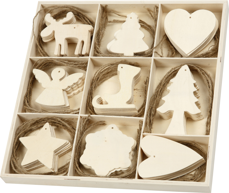 Ett kreativt pyssel inför julen - Julhängen i ljust trä/pywood med upphängningssnöre. Levereras i displaybox. Förpackning med 9 mixade designer ā 8 st.
