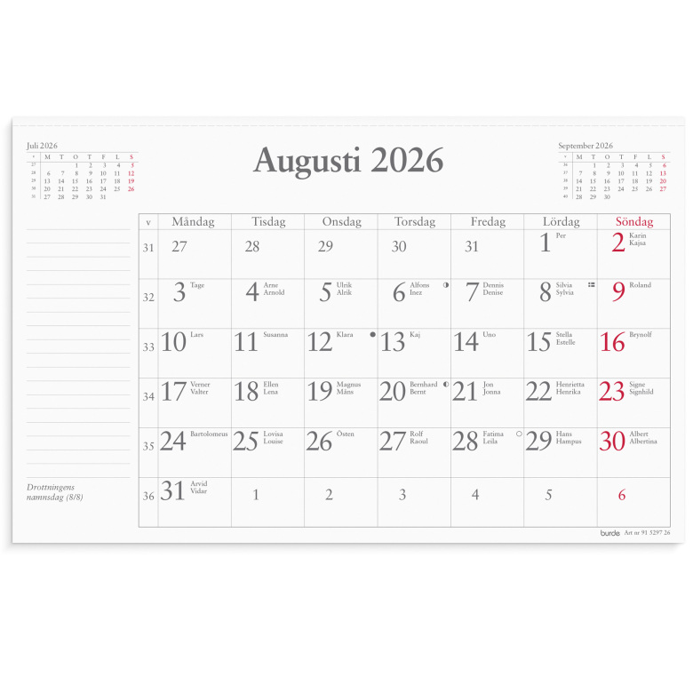 --Innehåll: Flaggdagar, Helgdagar, Månfaser, Namnsdagar.