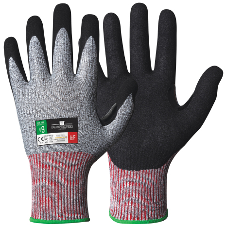 Skärskyddshandskar, Oeko-Tex® 100-godkända. HPPE Typhoon®- material med enkeldoppad sandaktig nitrilbeläggning.