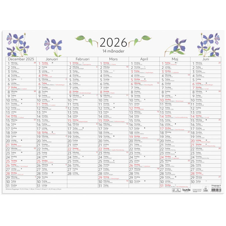 Kalender som väggblad. 14 månader, december från föregående år och januari för nästkommande år. Sju månader per sida. Namnsdagar och plats för anteckningar.
