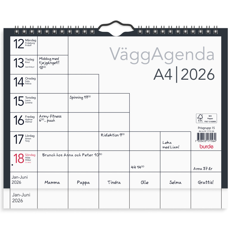 Väggkalender Årsplan 2026 från Burde. --Format: 230x330 mm --Layout: Halvår/sida --Kalendarium: 2026-01-01?2026-12-...Art nr. 6150302643,00 kr