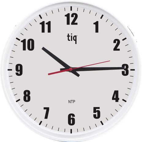 NTP-ur (Network Time Protokoll), ger ett helautomatiskt pålitligt tidssystem som kopplas in i datanätverket. Klockan levereras inställd på CET (Central European Time), samt har automatiskt justering för sommar/vintertid (även denna är förprogmerad). Tidszon och sommar/vintertid kan även justeras lätt med ett enkelt dataprog som kan laddas ner från nätet. Klockan ansluts till ett lokalt trådbundet nätverk via nätverkskabel, kräver alltså lite kabeldragning. Nätverket måste ha en aktiv DHCP (IP-adress-utdelning). Ström kan tillföras på 3 olika sätt: Switch med PoE-utgångar, Separat PoE injector, separat 230 volt adapter. (PoE = Power over Ethernet) . -- Ø 348 mm -- Plast -- Vit ram -- Vit urtavla -- Stora svarta siffror -- Visar - timmar, minuter, sekunder -- Röd sekund-visare -- Plastlins