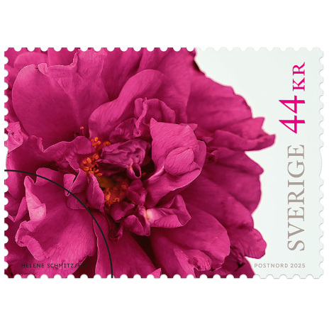 Frimärke Utrikes Rosor Hansa. Den vackra Hansa Rosen blommar nästan oavbrutet från början av juni till senhösten med sina purpurröda stora blommor. Aktuellt porto för utrikesförsändelser upp till 50 g.