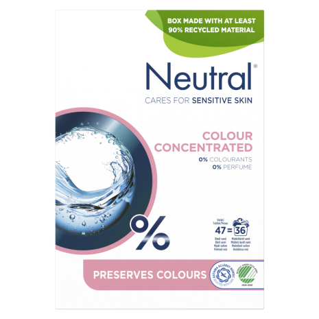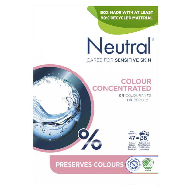 Neutral Colour är ett skonsamt pulvertvättmedel för färgade kläder ? särskilt utvecklat för känslig hud. Produkten är helt fri från parfym, färgämnen och onödiga tillsatser, vilket minimerar risken för allergier och överkänslighetsreaktioner. Neutral Colour rengör effektivt och tar bort både smuts och fläckar utan att påverka plaggets färger. Innehåller inte blekmedel. Rekommenderas av Astma- och Allergiförbundet.
