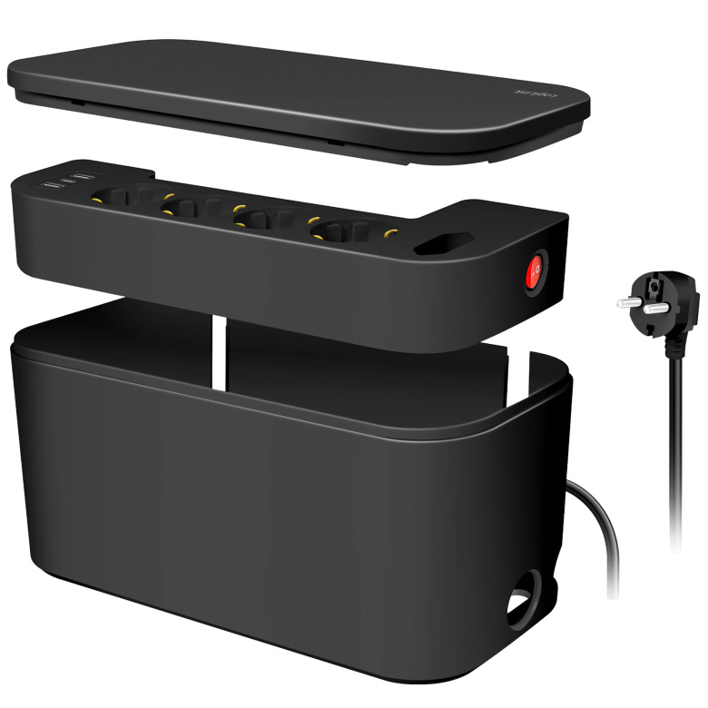 Kabelboxen från LogiLink är en modern och praktisk box med inbyggt 5-vägs grenuttag och 3 USB-portar. Du kan strömförsörja och ladda upp till 8 enheter samtidigt ? perfekt för både hem och kontor. Boxen hjälper till att organisera kablar på ett säkert, dammskyddat och platsbesparande sätt, och minskar risken för snubbelolyckor. Kabelgömman har fyra Schuko-uttag (CEE 7/3), ett Euro-uttag (CEE 7/16), två USB-A-portar och en USB-C-port.